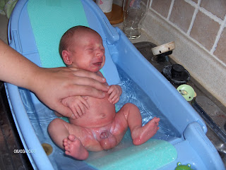 Finally, we were able to give the boys their first bath. We could have done it a few days ago, but who has the time. Between all of the feedings we figured we would do it next time. We said that over and over and we were able to do it Sunday night. I figured that they would not like it much but after a while in the water they seemed to like it. Here are some pictures of this First moment to remember. Now I have something to scrapbook.